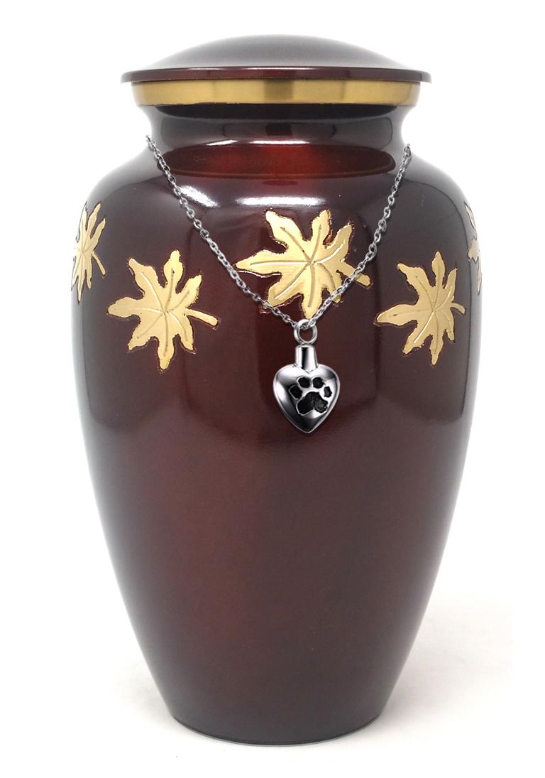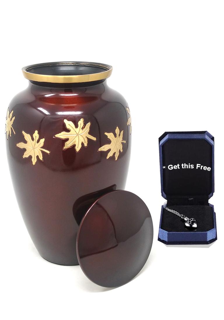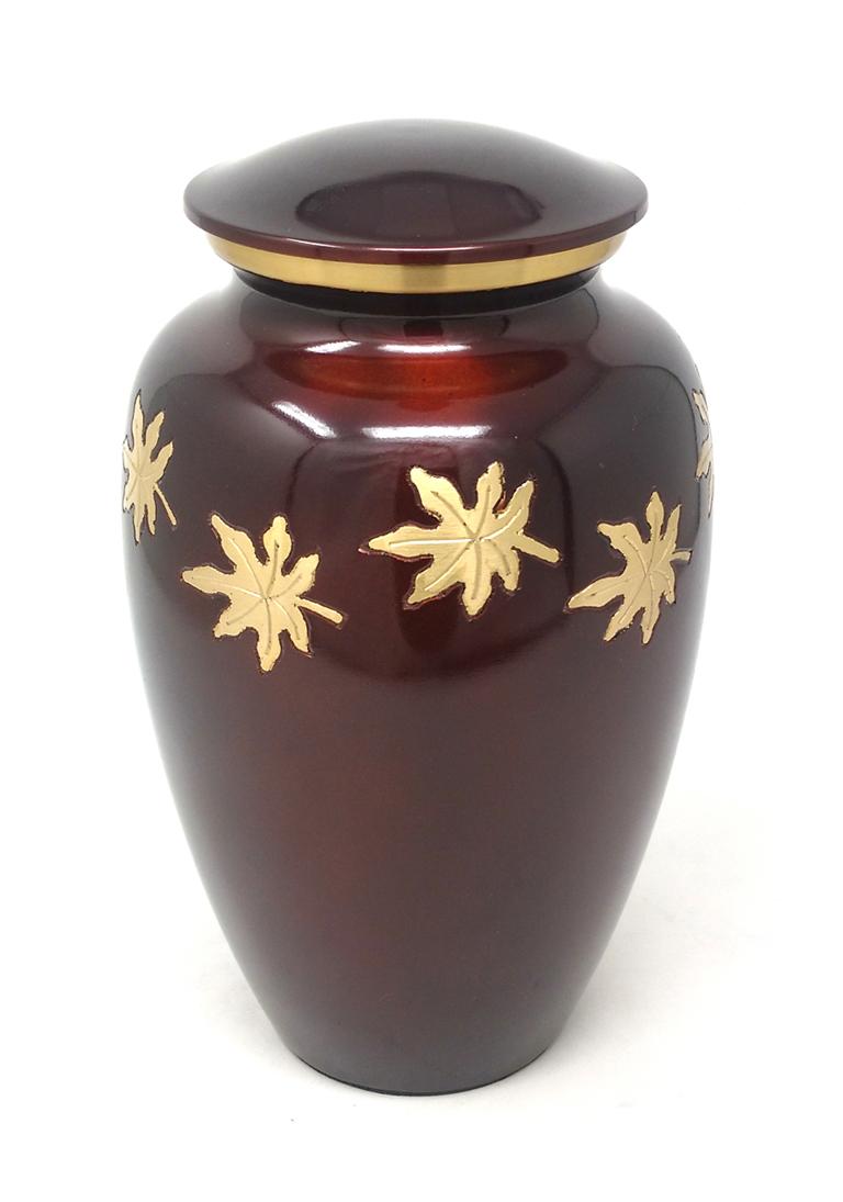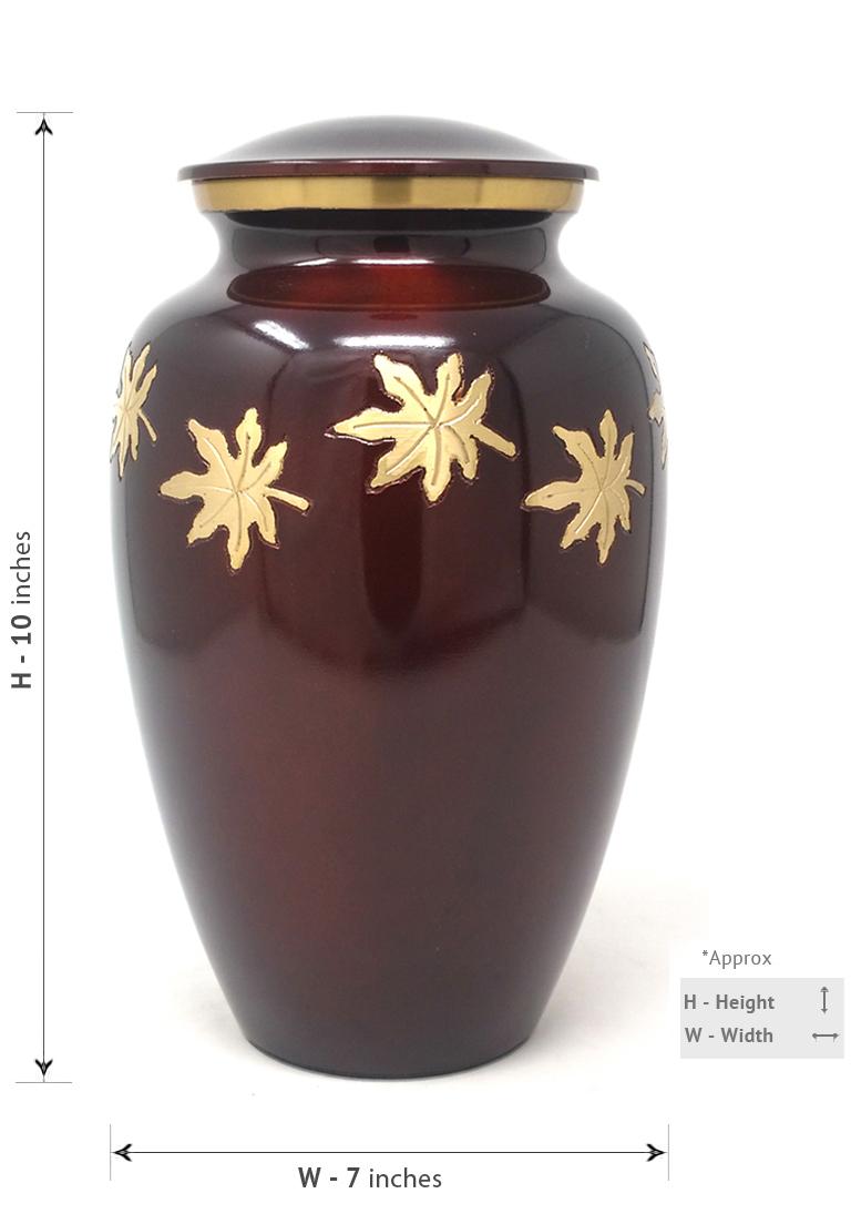 The Large Falling Leaves Cremation Urn is crafted from brass. The urn has a beautiful hand-painted finish. The large brass falling leaves cremation urn has on lid used for secure closure of the demised loved one's ashes in the urn with screw threading on the top.