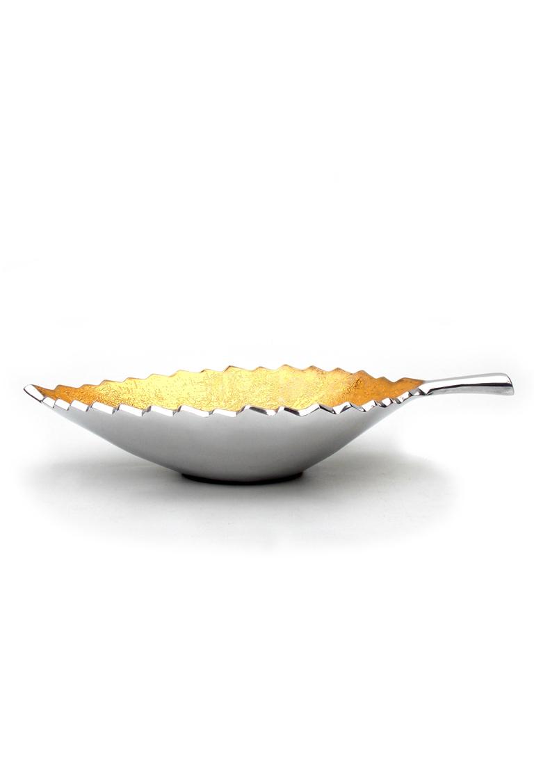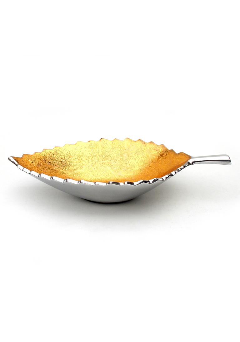 Metallic designed dish tray is a hand engraved dish bowl for household and utility purpose. The dish tray hollow spaced at the center with leaf edge cuts on the corners of the dish bowl. The metallic bowl tray is made of aluminium with gold coating in the hollow space at the center.