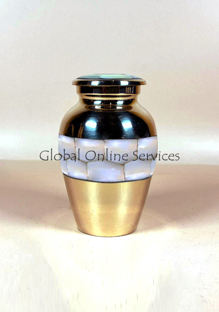 The elite mother of pearl urn is cremation urn made of high quality fine solid brass material. The skilled artisans have intricately hand designed this urn to hold token amount of ashes of adults or child. It has been finish with brass with mother of pearl.