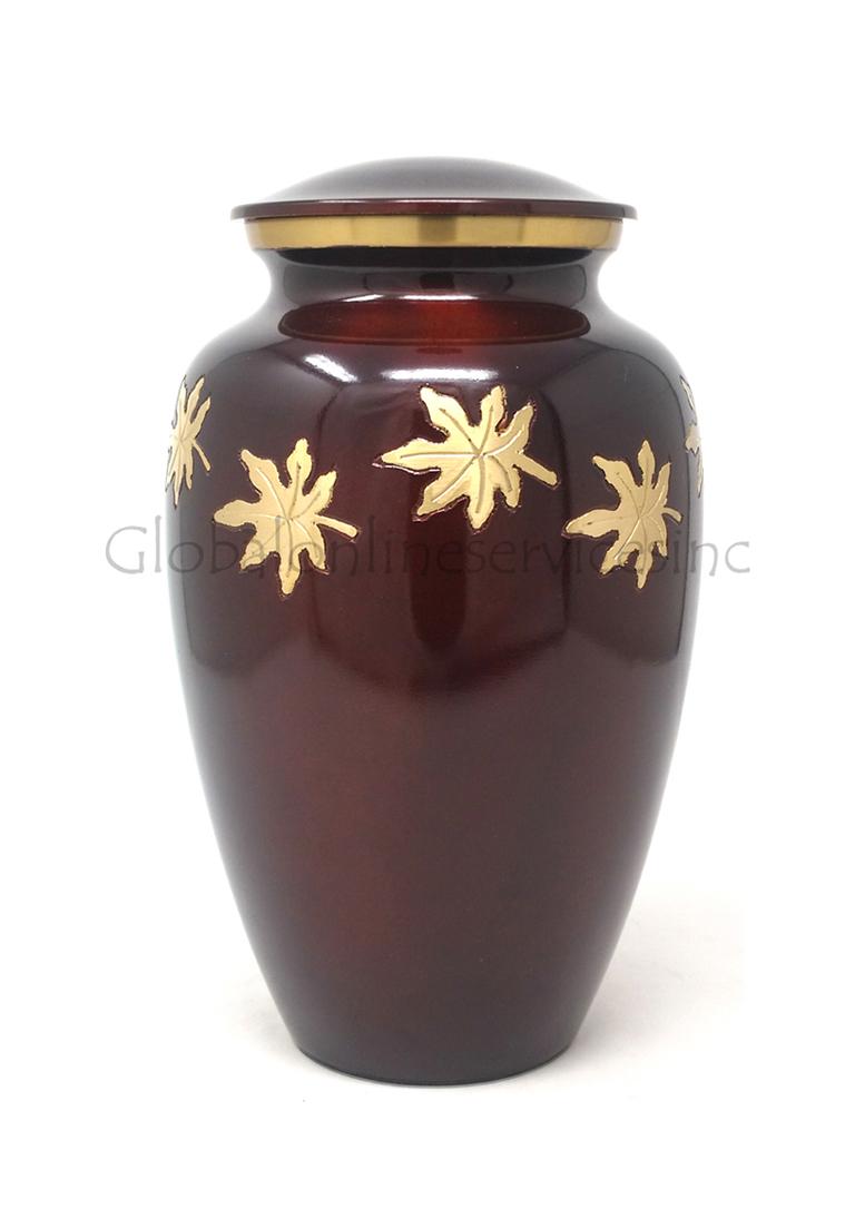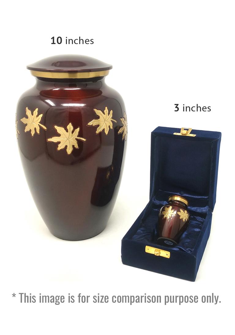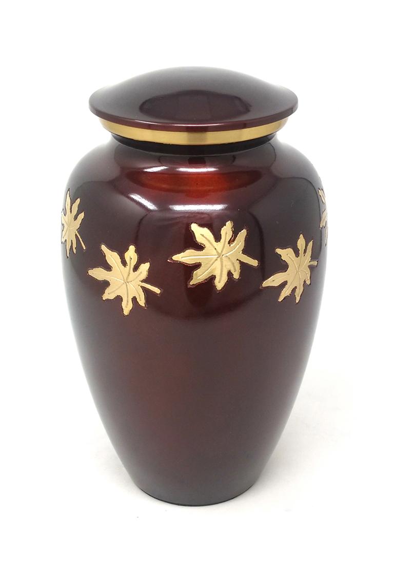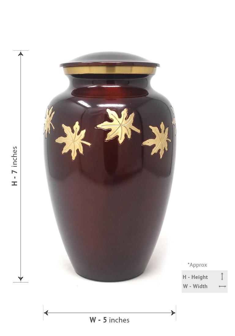 The medium falling leaves cremation urn is crafted from brass. The urn has a beautiful hand-painted finish. The medium brass falling leaves cremation urn has on lid used for secure closure of the demised loved one’s ashes in the urn with screw threading on the top.