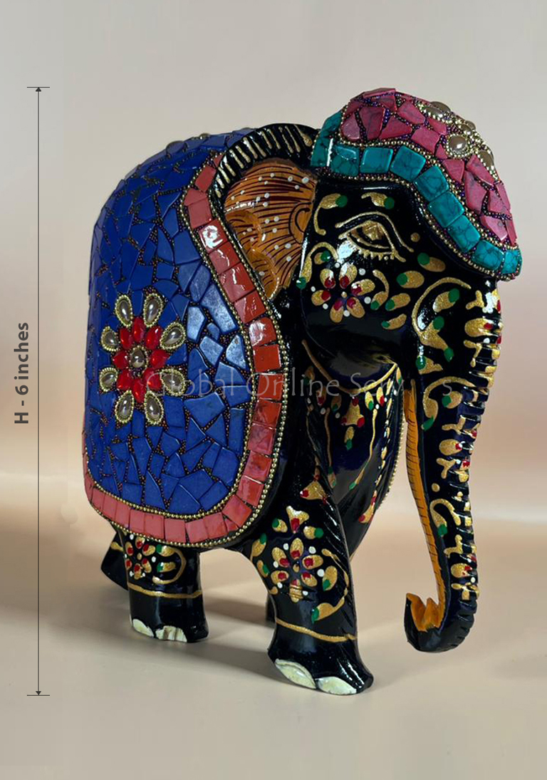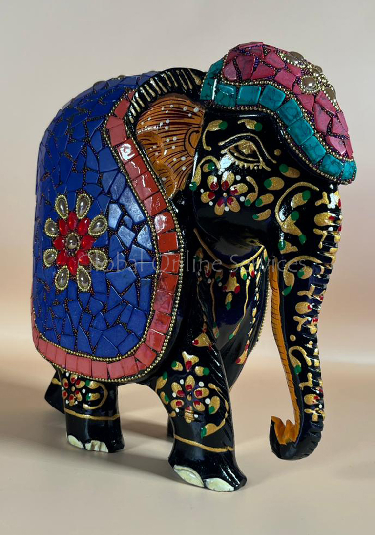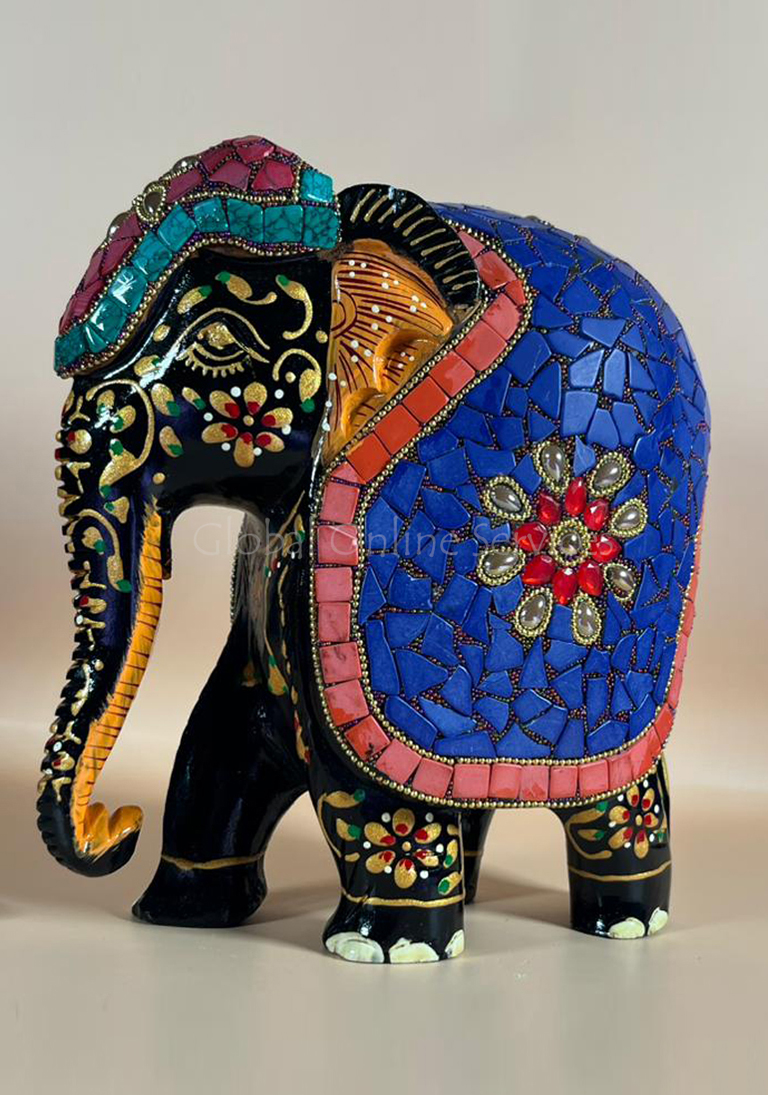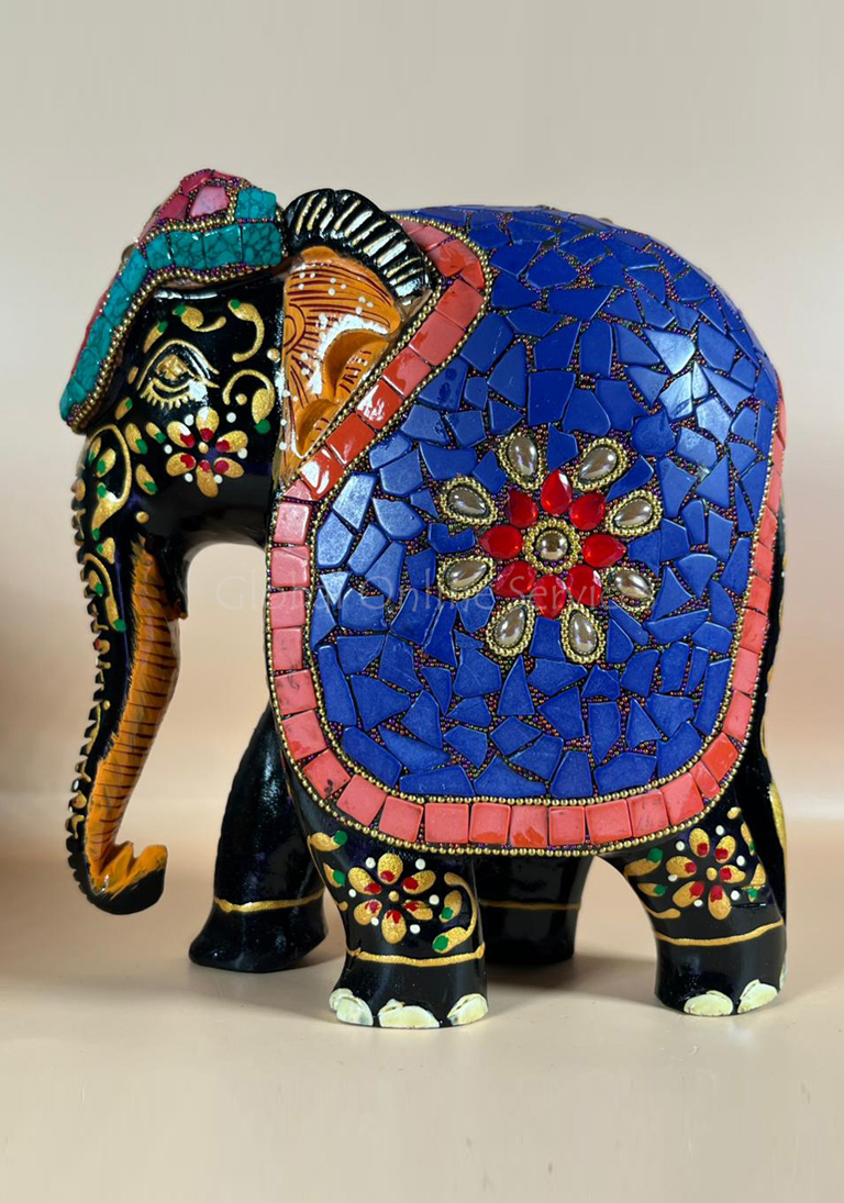 - Hand Painted Mosaic Elephant with Multicolor Stone Inlay with Imperial Blue Saddle Motif