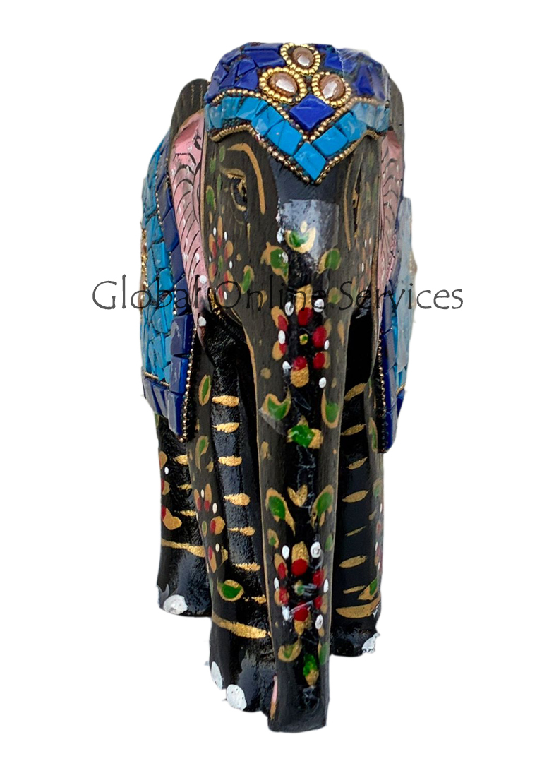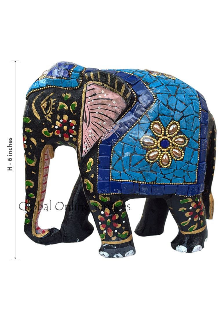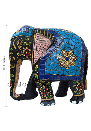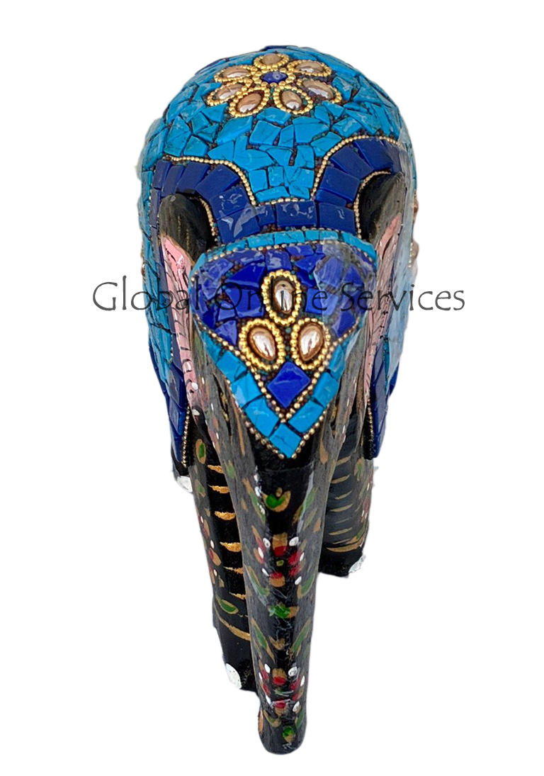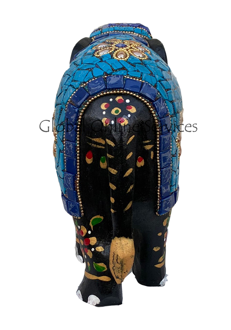 - Hand Painted Mosaic Elephant with Multicolor Stone Inlay with Blue Saddle Motif