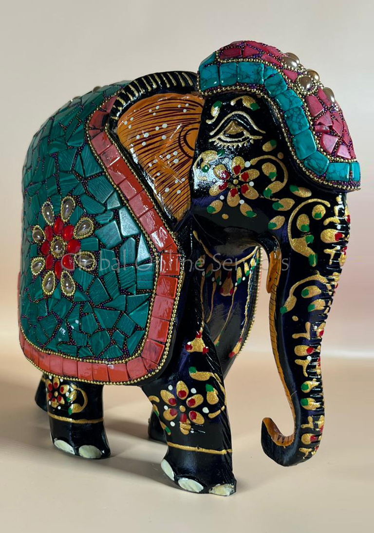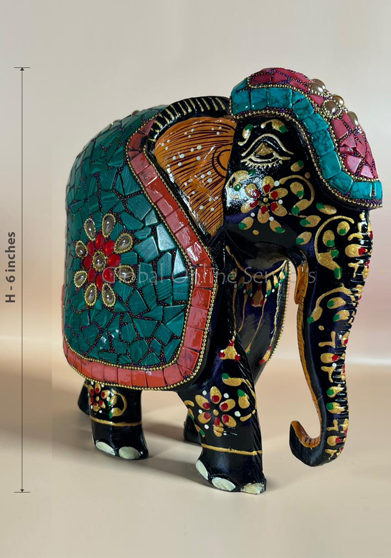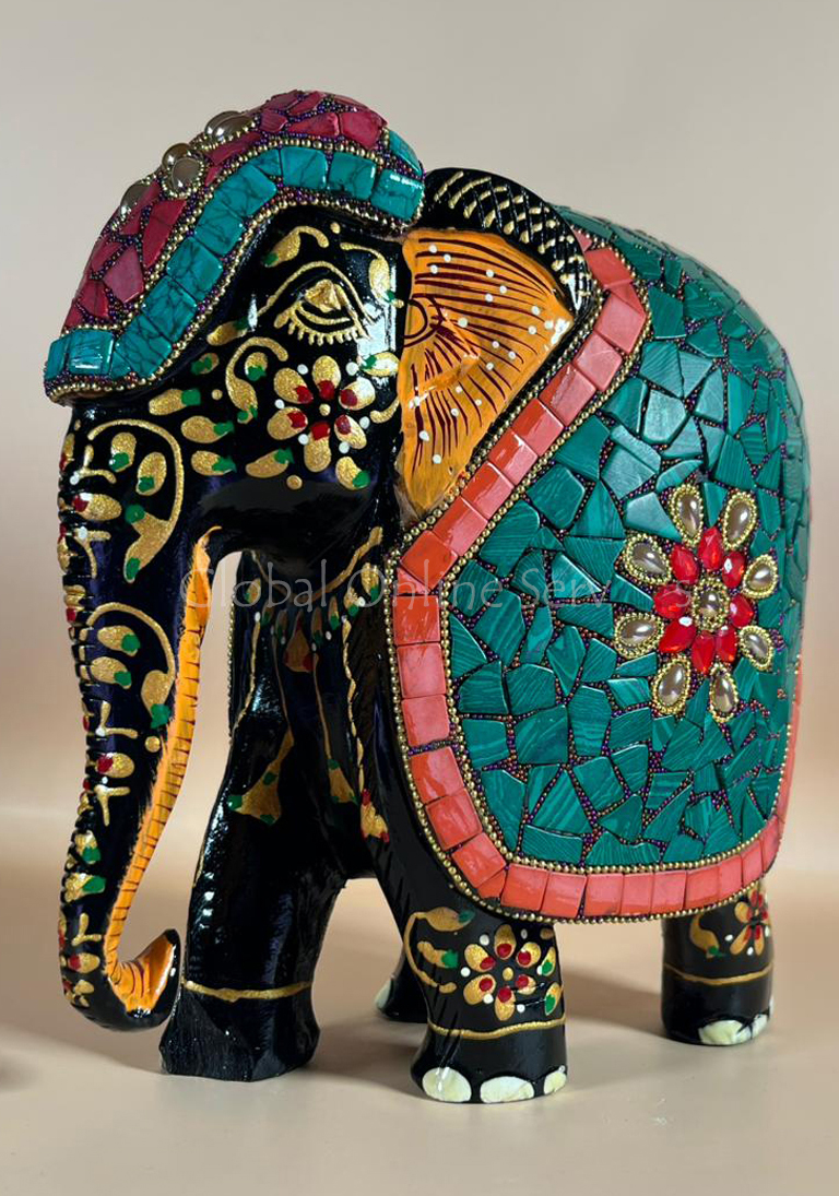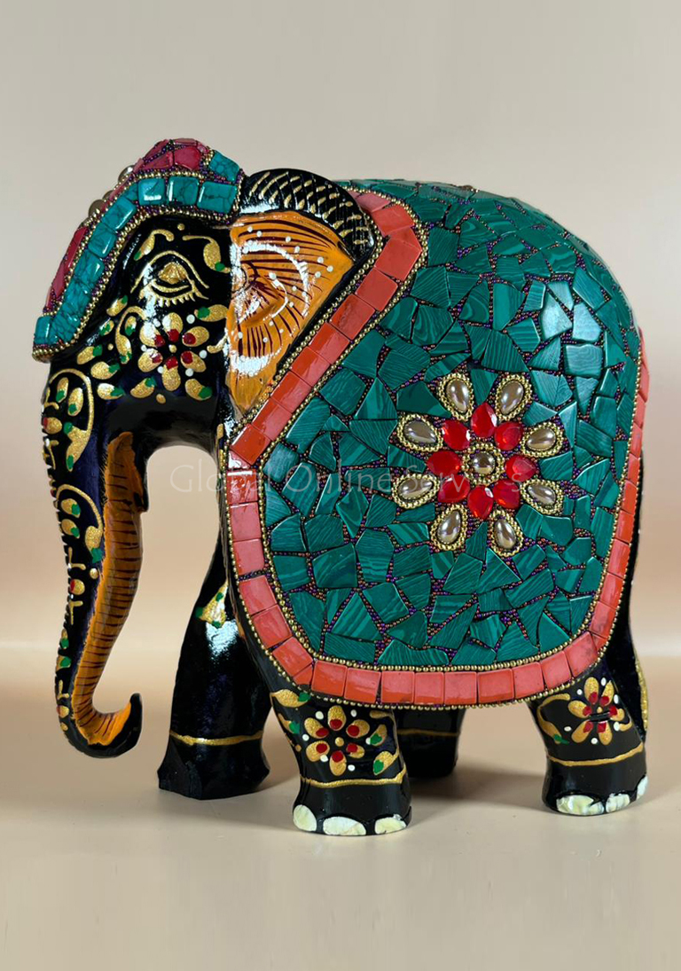 - Hand Painted Mosaic Elephant with Multicolor Stone Inlay with Green Saddle Motif