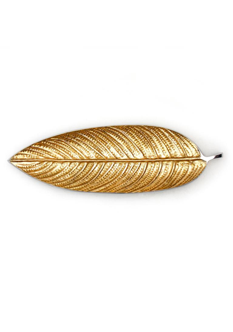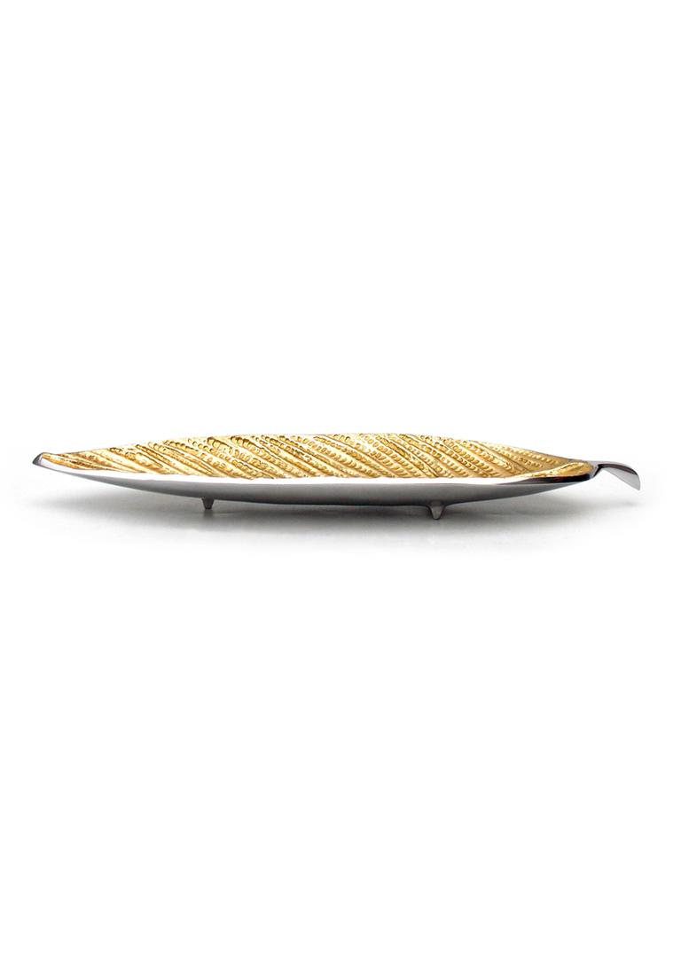 Nickel finished metallic leaf dish tray is made of aluminium with top layer coating of Nickel. The leaf engravings of dish tray are printed with veins and flat edges. The leaf pattern has a long stretch with gold.